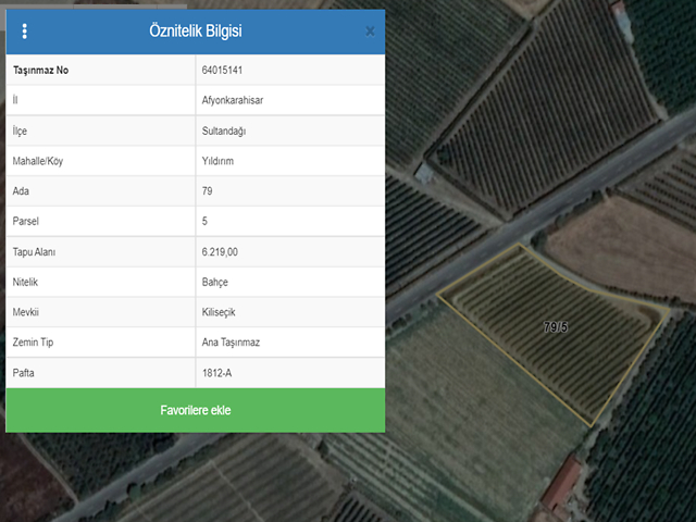 Özellikler: 79 ada 5 nolu parsel 6219 m2 alanlı olup Bahçe vasıflı taşınmazdır. Parselin üzerinde herhangi bir yapı ya da yapılaşma bulunmamaktadır. Parsel yamuk geometrik şekle sahip olup eğimsiz bir topografyaya sahiptir. Taşınmazın sınırlarını belirleyici olarak tel çit ile çevrili olduğu tespit edilmiştir. Parsel üzerinde elma ağaçlarının olduğu tespit edilmiştir. Parsel batı ve kuzey cephelerinden kadastro yoluna diğer cephelerden ise kadastro parsellerine cephelidir.