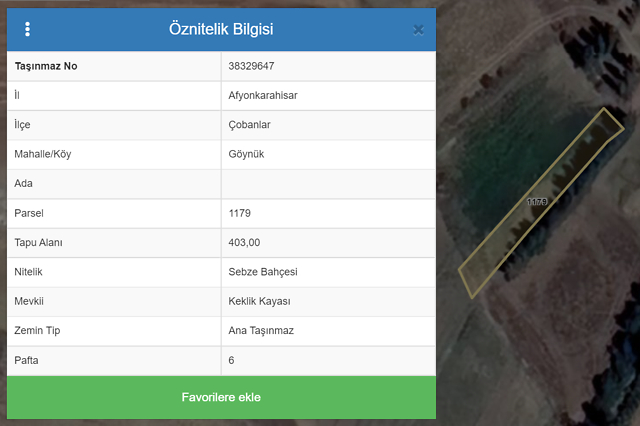 Özellikler: 1179 parselde yer alan taşınmaz 403 m2 alanlı olup sebze bahçesi vasıflıdır.