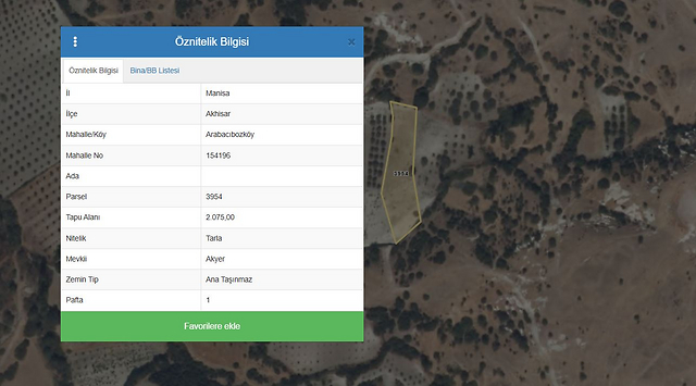 Özellikler: 3954 parsel, Manisa ili, Akhisar ilçesi, Arabacıbozköy Mahallesi, Akyer Mevkiinde yer alan, 2.075,00 m² alanlı Tarla vasıflı taşınmazdır. Akhisar Kadastro Müdürlüğünde incelenen kadastral paftasına göre taşınmazın kadastral yola cephesi olmayıp, doğu ve batı yönlerden komşu parsellere, kuzey ve güney yönlerden tapulama harici alana cephelidir. Taşınmazın boş konumlu olduğu ve uzun süredir ekim dikim yapılmadığı görülmüştür. Taşınmazın müstakil suyu olmadığı gibi bulunduğu bölgede sulama imkanı bulunmadığı, kuru tarım arazisi olduğu görülmüştür. Taşınmazın parsel bazında konum teyidi Akhisar Kadastro Müdürlüğünde incelenen paftasından ve yerinde alınan uydu görüntüleri çakıştırılarak yapılmıştır.