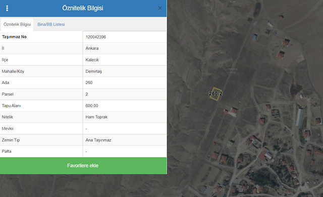 Özellikler: Taşınmaz Ankara ili, Kalecik ilçesi, Demirtaş Mahallesi, 260 ada 2 parselde konumludur. Taşınmaz Arsa vasıflı olup 600,00 m2 yüz ölçümlüdür. Geometrik olarak dikdörtgen yapıdadır. Taşınmaz yola 28 metre mesafede olup mahalle merkezinde konumludur.