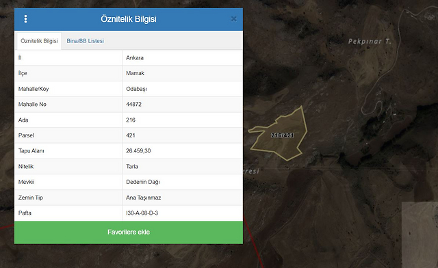 Özellikler: Ankara İli, Mamak İlçesi, Odabaşı Mahallesi, Dedenin Dağı Mevkii adresinde kain, tapuda Mamak İlçesi, Odabaşı Mahallesi, 216 Ada 421 Parsel, 26.459,30 m² yüzölçümlü, tarla vasıflı taşınmazdır.