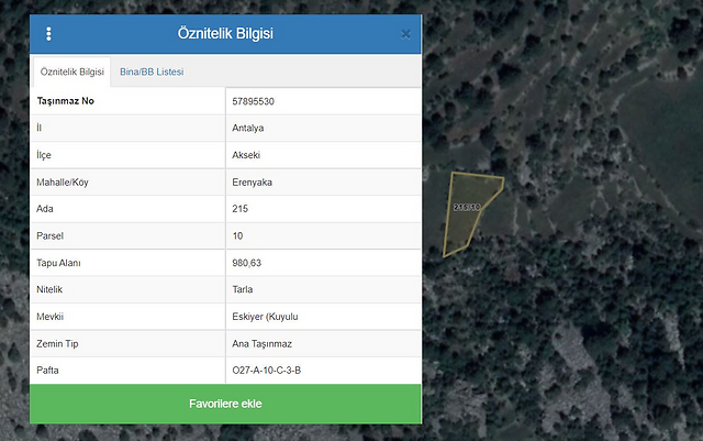 Özellikler : Gayrimenkul Antalya ili Akseki ilçesi Erenyaka Köyü 215 ada 10 parselde yer almaktadır. Tapu vasfı ‘TARLA’dır. Yüzölçümü 980,63 m²’dir. Yayla Köyü’ne 2,5 km uzaklıktadır. Mülk sahibinden gelen bilgiye göre taşınmaz elektrik ve suya yakındır.