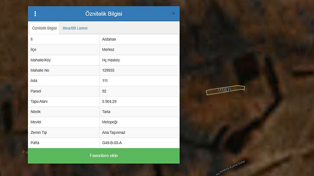 Özellikler: 111 ada 92 parsel; 5904,29 m2 yüz ölçümlü, dikdörtgene yakın bir şekle sahip, az eğimli bir topografik yapıdadır. Üzeri kar ile kaplı kadastral yola (stabilize) cephesi olmayan parsel üzerinde herhangi bir tarım yapılmadığı gözlenmiştir. Parsel sınırları doğal tarla sınırı şeklindedir. Parsel sulama imkanına sahip değildir.