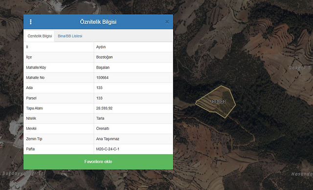 Özellikler: Aydın ili, Bozdoğan ilçesi, Başalan Mahallesi Örenaltı 135 ada 133 parselde kayıtlı TARLA dır. Taşınmaz geometrik olarak amorf, topoğrafik olarak oldukça eğimli konumdadır. Taşınmazın batı cephesinin uç noktası komşu parsele bitişik olup, diğer tüm cepheleri kadastro boşluğudur. Taşınmaz orman alanı içerisinde yer almakta olup içerisinde çok sayıda çam ağacı bulunmaktadır. Parselde sınırlayıcı hiç bir eleman bulunmamaktadır.
