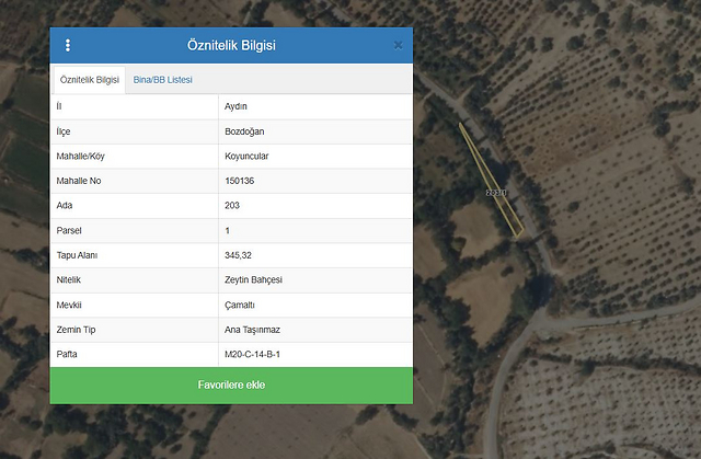 Özellikler: Aydın ili, Bozdoğan ilçesi, Koyuncular Mahallesinde konumlu 345,32 m² yüzölçümüne sahip 203 ada 1 parsel numaralı Zeytin Bahçesi nitelikli taşınmazdır.