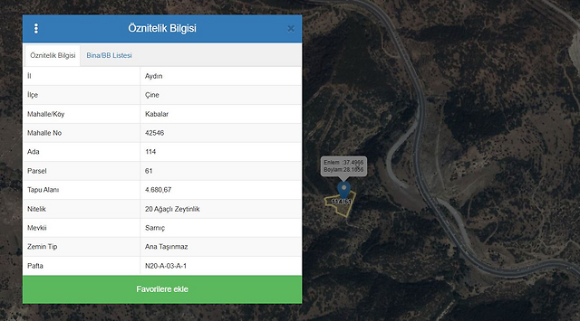 Özellikler : Taşınmaz; Aydın ili, Çine ilçesi, Kabalar mahallesi, mevkinde konumlu '20 Ağaçlı Zeytinlik' vasfında taşınmazdır. Toplam yüzölçümleri 4.680,67 m2'dir.