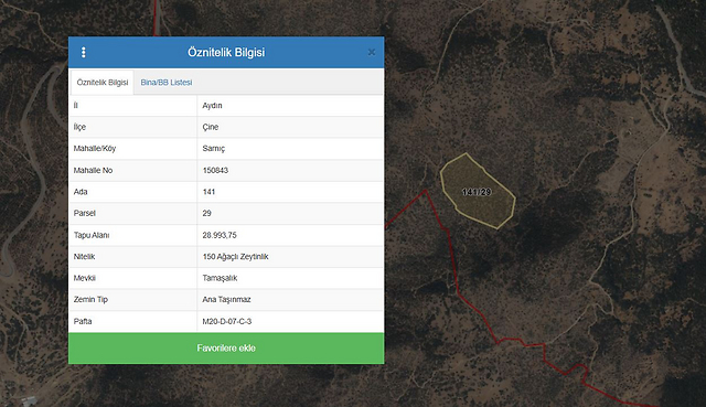 Özellikler: Aydın İli, Çine İlçesi, Sarnıç Mahallesi, Tamaşalık mevkii sınırları içinde 141 ada 29 parselde kayıtlı 28.993,75 m2 alana sahip 150 Ağaçlı Zeytinlik vasıflı arazi olup mahallinde zeytinlik olarak kullanılmaktadır. Geometrik olarak belirgin bir şekli bulunmamaktadır. Taşınmaza Kavşit mahallesi asfalt yolundan itibaren stabilize toprak yol ile ulaşım sağlanmaktadır. Engebeli arazi yapısına sahiptir. Dikili tarım yapmaya elverişli bölgede yer alan taşınmaza ulaşım kolaylıkla sağlanmaktadır. Parsel üzerinde düzenli bir dikim yapılmamıştır. Parselin muhtelif bölümlerinde taşlık kayalıklardan oluşan kısmi boşlukşar bulunmaktadır. Parsel üzerinde yaklaşık 500 civarında 30-50 yaşlarında zeytin ağacı dikili olduğu görülmüştür.
