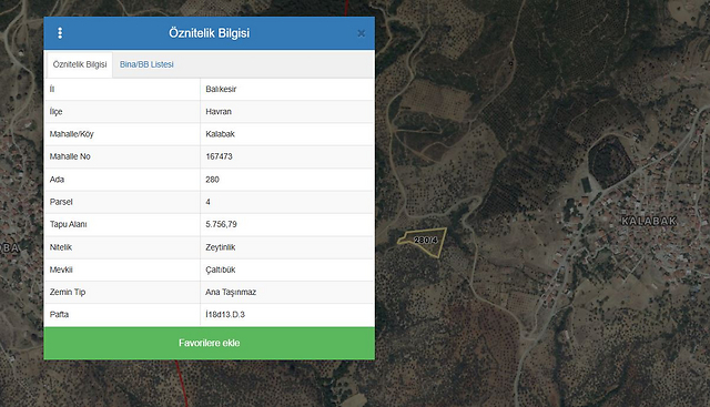 Özellikler: Balıkesir İli, Havran İlçesi, Kalabak Mahallesi, 280 ada 4 parsel posta adresinde konumludur. 5.756,79 m2 yüzölçümüne sahiptir. Konu parsel şekilsiz formda, orta meyilli bir topoğrafyaya sahip olup; güney yönde kadastro yoluna yaklaşık 130 metre cephelidir. Yerinde yapılan incelemelerde neticesinde parsel üzerinde herhangi bir yapı bulunmadığı görülmüştür. Havran Belediyesi imar müdürlüğünde yapılan incelemede bölgenin imar planı sınırları dışında kaldığı, parsele ilişkin düzenlenmiş herhangi bir ruhsat, iskan ve projeye bulunmadığı öğrenilmişti