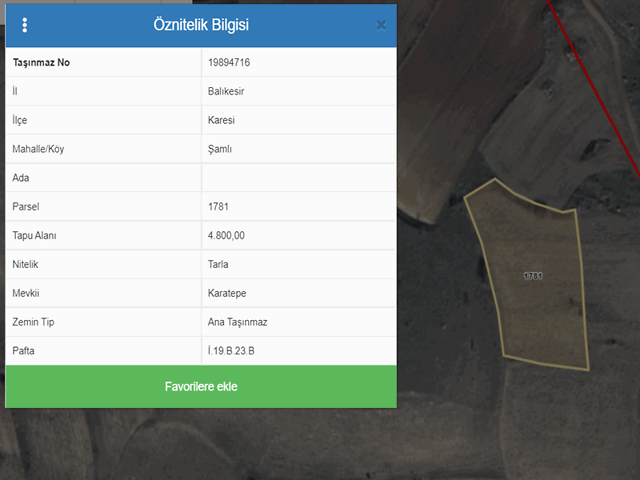 Özellikler: Karatepe Mevkii’ nde konumlu, 4.800,00 m2 yüzölçümlü, ‘Tarla’ vasıflı taşınmaz dörtgene benzer bir forma, topografik olarak ise eğimsiz bir arazi yapısına sahiptir. Taşınmaz; Balıkesir İl ve Karesi İlçe Merkezi’ nin ~19 km. kuzeyinde, Şamlı Mahalle Merkezi’ nin ise ~3,75 km güneydoğusunda yer almaktadır. Parselin kadastro yoluna cephesi bulunmamakta olup, komşu parsellere cephelidir.