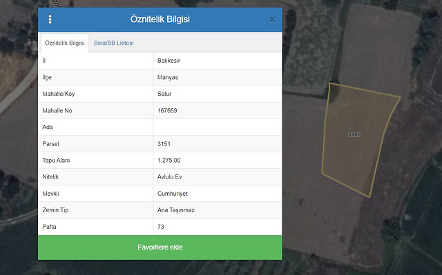 Özellikler: Balıkesir İli, Manyas İlçesi, Salur Mahallesi, Cumhuriyet Mevkii, 1.275,00 m² yüzölçümlü, 3151 parselde kayıtlı “AVLULU EV” nitelikli taşınmazdır. Parsel eğimsiz topoğrafik yapıya sahip olup dikdörtgene yakın formdadır. Mevcut durumda parselin boş olduğu görülmüştür ve üzerinde ekili-dikili ürün bulunmamaktadır. Taşınmazın DSİ sulama kanalından sulama imkanı bulunmakta olup sulu tarım yapılmaktadır. Parsel tüm yönlerden komşu parsellere cepheli durumdadır.