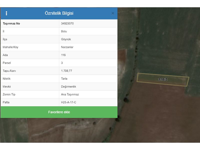 Ulaşım: Bolu İli, Merkez İlçesi, Narzanlar Köyü, Değirmenlik Mevki’nde konumlu, 1708.77m2 alanlı, tapuda vasfı " TARLA " olan, 116 ada 3 parseldir. Söz konusu taşınmaz; "TARLA" nitelikli olup üzerlerinde yapı bulunmamaktadır. 140 kişilik nüfusa sahip Narzanlar Köyü sınırları içerisinde bulunan taşınmaza ulaşım için; Narzanlar Köy Merkezi’nden güneybatı istikamette yaklaşık 2km ilerlenir. Narzanlar Köyü, Göynük İlçe Merkezi’nin güney batısında ve şehir merkezine yaklaşık 30km, Bolu İl Merkezine yaklaşık 125km mesafededir. Bölgede yapılaşma düşük düzeyde olup köy merkezlerinde genel olarak 12 katlı yapılaşma hakimdir. Konu taşınmazların yakın çevresinde boş tarlalar yer almakta olup, köy içine yakın bölgelerde kümes hacimleri , köy yerleşik alanları bulunmaktadır. Taşınmaza ulaşım özel araçlarla rahatlıkla sağlanmaktadır.