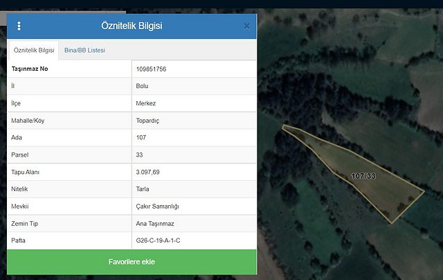 Özellikler : Gayrimenkul Bolu İli, Merkez İlçesi, Topardıç köyünde 107 ada 33 parselde yer almaktadır. Tapu vasfı 'TARLA' olup 3.097,69 m2'dir. Gayrimenkulün şekli amorf formadadır. Köy merkezine uzaklığı 3,3 km'dir.