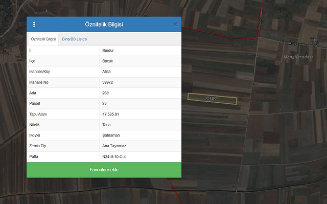 Özellikler: 269 ada 28 no.lu parsel 47.535,91 M2 yüzölçümlü tarla nitelikli taşınmazdır. Taşınmaz şekil olarak dikdörtgen şekilli olup düz bir topoğrafyaya sahiptir. Taşınmazın üzerinde halihazırda herhangi bir ekili ürün bulunmamaktadır. Taşınmazın zeminde sınırlarını belirleyici herhangi bir unsur bulunmamakta olup konum tespiti Bucak Belediyesi İmar Müdürlüğü’nden alınan 37.410987, 30.482602 koordinatlara göre yapılmıştır. Taşınmazın kadastro paftası incelendiğinde herhangi bir kadastral yola cephesinin olmadığı ulaşımın batı cephesindeki tarlanın içinden sağlandığı tespit edilmiştir. Parselin doğu-batı yönünde 552 m., kuzey güney yönünde ise yaklaşık 78 m. parsel cephe uzunluğuna saiptir.