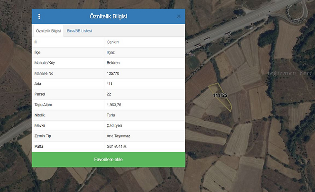 111 Ada 22 parsel; Çankırı ili Ilgaz ilçesi Belören köyü Çadıryeri mevkisi 111 ada 22 parsel 1963,75 m² alana sahip tarla vasıflı taşınmazdır. Taşınmazın kadastro yoluna cephesi bulunmamaktadır. Taşınmaz amorf şekilde ve düz bir topoğrafyaya sahiptir. Taşınmazın sulama imkanı bulunmamaktadır. Taşınmaz hali hazırda bir kısmı üzerinde ağaçlar bulunmakta olup tarımsal faaliyet gözlenmemiştir. Taşınmazın sulama imkanı bulunmamaktadır. Köy merkezine kısmen yakın noktadadır. Taşınmaz 15/32'si hisseli olup hisseye düşen 920,51 m2'dir.