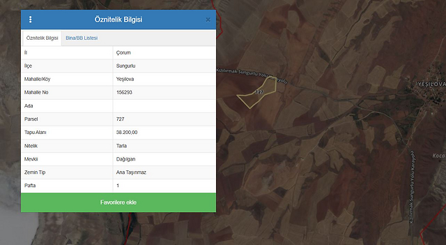 Özellikler: Çorum ili, Sungurlu ilçesi, Yeşilova Köyü, Dağılgan Mevkii, 727 parseldeki konumlu taşınmaz, 38.200,00 m² yüzölçümlü olup tapu kayıtlarında ‘Tarla’’ vasıflıdır. Parsel yol üzerindedir. Parselin kuzeyinde Kızılırmak-Sungurlu yolu, güneyinde 725 parsel, batısında 728 parsel, doğusunda 726 parsel bulunmaktadır. Parselin kuzeyde yer alan yola olan cephesi 62 m, güneyinde yer alan komşusuna olan cephesi 176m, batısında yer alan komşusuna olan cephesi 424 m, doğusunda yer alan komşusuna olan cephesi ise 381m kadardır. Parsel geometrik olarak düzgün bir forma sahip olmayıp yamuk formdadır. Topografik olarak parsel güney yönde yüksek eğime sahiptir. Parselin sınırları yerinde belirgin bir unsur ile çevrilmemiştir. Taşınmaz üzerinde herhangi bir yapı bulunmamaktadır.