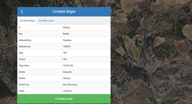 Özellikler : Taşınmaz; Denizli ili, Bekilli ilçesi, Yeşiloba - Öküzini mahallesi, mevkinde konumlu 'Meyvelik' vasfında taşınmazdır. Toplam yüzölçümleri 15.811,03 m2'dir.