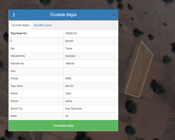 Özellikler: Tapu niteliği Tarla olan Gayrimenkulün; Denizli Tavas Aydoğdu 0 Ada 4898 Parsel konumundadır. Tapu alanı 900m2 dir. Gayrimenkul Aydoğdu Barajı manzaralıdır. Bağlı bulunduğu köy yerleşiminde market ve cami vardır. Köy yerleşim merkezine 4 km, İlçe merkezine 15km Denizli il merkezine 50km mesafededir.