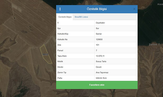 Özellikler : Taşınmaz; Diyarbakır ili, Sur ilçesi, Sarılar mahallesi, mevkinde konumlu 'Susuz Tarla' vasfında taşınmazdır. Toplam yüzölçümleri 13.076,11 m2'dir. Parsel şekilleri düzgün yapıdadır.