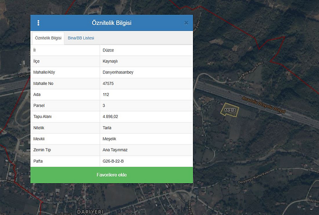 Özellikler: Darıyerihasanbey Köyü, Meşelik Mevkii, 112 Ada, 3 Parsel, Kaynaşlı/ DÜZCE posta adresinde yer almaktadır.
