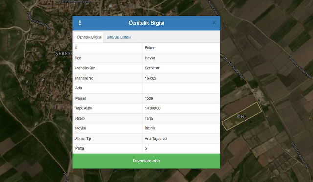 Özellikler: Edirne ili, Havsa ilçesi, Şerbettar Köyü, İncirlik Mevki, 1539 parselde kayıtlı Tarla vasfındadır. Taşınmaz; köy merkezinin yaklaşık 1 km güneydoğusunda yer almaktadır. Dikdörtgene benzer bir geometrik şekle sahip olup kısmen eğimli topografik yapıdadır. Konu taşınmazın güney ve doğu yönlerinden kadastral yola cephesi bulunmaktadır. Taşınmazın sulama imkanı bulunmaktadır. Herhangi bir ürün ekili değildir. Ancak yer görme esnasında kademeli çeltik ekimi tarlalarının olduğu tespit edilmiştir. Parselin yerinde sınırlarını belirliyici herhangi bir unsur bulunmamaktadır.