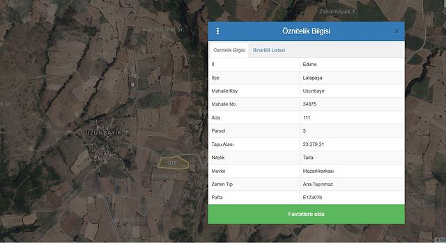 Özellikler : Taşınmaz; Edirne ili, Lalapaşa ilçesi, Uzunbayır mahallesi, Mezarlıkarkası mevkinde konumlu 1 adet 'Tarla' vasfında taşınmazdır. Toplam yüzölçümleri 23.379,31 m2'dir. Parsel şekilleri düzgün yapıdadır.