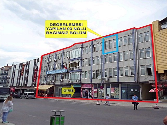 Özellikler : Ana gayrimenkul; 685 ada, 144 parsel, 1631,14m² alanlı arsası üzerine betonarme karkas inşaat tarzında 3/B yapı grubunda, yaklaşık 19 yıl önce inşa edilmiştir. Edirne Tapu Müdürlüğü’nde bulunan yasal onaylı mimari projesi ve kat irtifak listesine göre bodrum kat, zemin kat ve 3 normal kat olmak üzere toplam 5 katlı inşa edilmiştir. Binanın bodrum katında otopark, 18 adet bağımsız bölüm, zemin katta 23 adet bağımsız bölüm,1. , 2. normal katında ve 3. Normal katlarda 18 adet bağımsız bölüm olmakla birlikte toplamda 95 adet bağımsız bölüm bulunmaktadır. Bina girişi zemin kattan ve Talatpaşa Caddesi üzerinden sağlanmaktadır. Bina dış cephesi mantolaması yapılmamıştır. Binanın dış cephesi BTB kaplama, bina giriş kapısı; orta kısmı camlı alüminyum doğramadır. Bina giriş holü, kat sahanlıkları ve merdivenler mermer kaplama, duvarları saten boyalıdır. Binada otopark bulunmaktadır. Isıtma sistemi doğalgaz kombi sistemidir. Binada oturum başlamıştır. 3/400 arsa paylı değerlemeye konu (93) bağımsız bölüm numaralı Mesken; Üçüncü katta bulunmakta olup bina girşine göre sağ tarafta, merdiven çıkışına göre sol tara a yer almaktadır. Yasal Onaylı Mimari Projesine göre; toplamda brüt 40,00m² alana sahiptir.