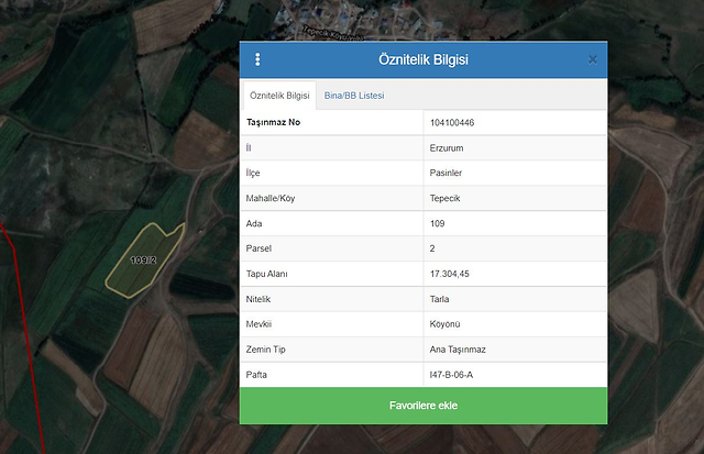 Özellikler: Erzurum ili, Pasinler ilçesi, Tepecik Mahallesi, Köyönü Mevkii, 109 ada 2 nolu parselde konumlanmaktadır. Taşınamaz 17.304,45 m² yüz ölçümüne sahiptir ve "Tarla" vasıflıdır. Parsel eğimsiz ve düz topografik yapıya sahip arazi parçası üzerinde yer almakta olup amorf geometrisindedir. Parsel tüm cephelerinde kadastro yollarına cephelidir. Parsel üzerinde herhangi bir yapı bulunmamaktadır. Sulaması bölgede yer alan sulama kanalları vasıtası ile yapılabilmektedir.