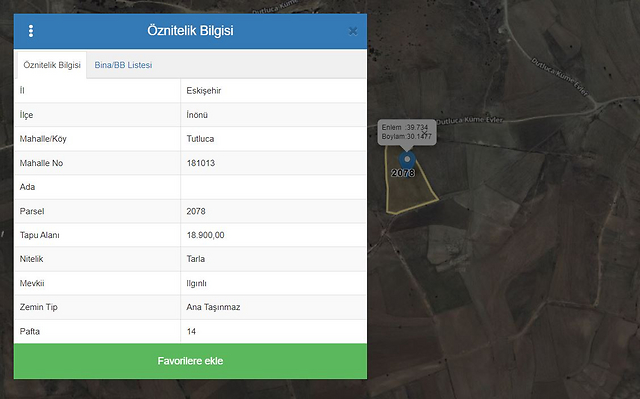 Özellikler: Taşınmaz Eskişehir İli, İnönü İlçesi, Tutluca Mahallesi, 14 Pafta, ILGINLI Mevki, 2078 Nolu parselde konumlanan 18.900 m2 alana sahip Tarla vasfındadır. Taşınmaz az eğimli bir topografik yapıya sahip olup, geometrik olarak şekilsiz amorf formdadır. Taşınmazın kuzey cephesinden kadastral yola cephesi bulunmaktadır. Taşınmazın üzerinde ekili ürün bulunmadığı ve taşınmazın kuru tarım arazisi olduğu görülmüştür. Taşınmazın etrafında tel örgü veya çit bulunmamaktadır.