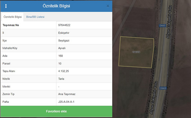 Özellikler: Taşınmaz Eskişehir İli Seyitgazi İlçesinde Ayvalı Mahallesinde 168 ada 10 parselde yer almaktadır. 4,132m² yüzölçümüne sahip 'Tarla' vasıflı mülktür. Taşınmaz geometrik olarak kare şeklindedir. Afyonkarahisar - Eskişehir yoluna cephelidir.