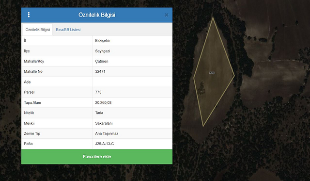 Özellikler: Eskişehir İli, Seyitgazi İlçesi, Çatören Mahallesi, Sakaralanı Mevkiinde yer alan 0 ada, 773 parsel numaralı 20260,03 m2 yüzölçümlü ‘’TARLA’’ nitelikli taşınmazdır. Parselin etrafında sulama yapabileceği herhangi bir kuyu, dere, kanal vb bulunmamakta olup doğal yollarla (yağmur, karsuyu vb) sulandığı, doğal yağışlar dışında kıraç arazi olduğu tespit edilmiştir. Parsel topografik olarak hafif eğimli, geometrik açıdan amorf formunda arazi yapısındadır. Taşınmazın kadastro yoluna cephesi bulunmamakta olup, tüm cephelerinden devlet ormanına cephelidir. Parselin çevresinde tel, çit, duvar vb. ayırıcı bir unsur bulunmamaktadır. Taşınmazın üzerinde herhangi bir yapıya rastlanmamıştır. İnceleme günü parsel üzerinde yabani ot mevcut olup ekili ürün bulunmamaktadır. Bölgede ağırlıklı olarak buğday, arpa vb. tarım yapılmaktadır.