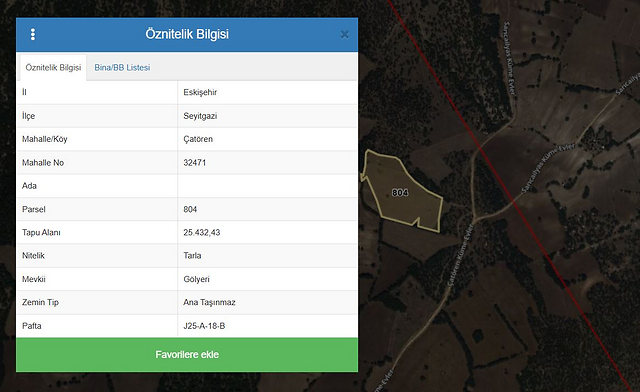 Özellikler: Eskişehir İli, Seyitgazi İlçesi, Çatören Mahallesi, Gölyeri Mevkiinde yer alan 0 ada, 804 parsel numaralı 25.432,43 m2 yüzölçümlü ‘’TARLA’’ nitelikli taşınmazdır. Parselin etrafında sulama yapabileceği herhangi bir kuyu, dere, kanal vb bulunmamakta olup doğal yollarla (yağmur, karsuyu vb) sulandığı, doğal yağışlar dışında kıraç arazi olduğu tespit edilmiştir. Parsel topografik olarak eğimsiz geometrik açıdan amorf formunda arazi yapısındadır. Taşınmazın kadastro yoluna cephesi bulunmamakta olup, kuzeydoğu ve güneydoğu cephelerinden devlet ormanına cepheli, diğer yönlerden benzer nitelikteki parsellere cephelidir. Parselin çevresinde tel, çit, duvar vb. ayırıcı bir unsur bulunmamaktadır. Taşınmazın üzerinde herhangi bir yapıya rastlanmamıştır. İnceleme günü parsel üzerinde hububat ekili olduğu tespit edilmiştir. Bölgede ağırlıklı olarak buğday, arpa vb. tarım yapılmaktadır.