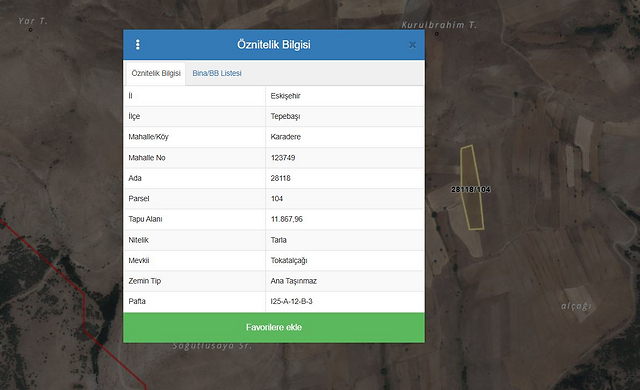 Özellikler: Eskişehir İli, Tepebaşı İlçesi, Karadere Mahallesi, Tokatalçağı Mevkiinde yer alan 28118 ada, 104 parsel numaralı 11.867,96 m2 yüzölçümlü ‘’TARLA’’ nitelikli taşınmazdır. Parselin etrafında sulama yapabileceği herhangi bir kuyu, dere, kanal vb bulunmamakta olup doğal yollarla (yağmur, karsuyu vb) sulandığı, doğal yağışlar dışında kıraç arazi olduğu tespit edilmiştir. Parsel topografik olarak hafif eğimli, geometrik açıdan amorf formunda arazi yapısındadır. Taşınmazın kadastro yoluna cephesi bulunmamakta olup, tüm cephelerinden komşu parsellere cephelidir. Parselin çevresinde tel, çit, duvar vb. ayırıcı bir unsur bulunmamaktadır. Taşınmazın üzerinde herhangi bir yapıya rastlanmamıştır. Arazinin yüz ölçümünün yarısı sürülmüştür. İnceleme günü parsel üzerinde yabani ot mevcut olup ekili ürün bulunmamaktadır. Bölgede ağırlıklı olarak buğday, arpa vb. tarım yapılmaktadır.