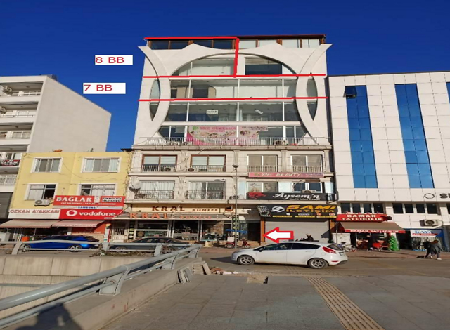 Özellikler : Taşınmazın bulunduğu bina, 1187 Parsel no.lu 170,27 m² alanlı arsa üzerinde bitişik nizamda, betonarme karkas yapı sisteminde, tek blok olarak inşa edilmiştir. Yapı bodrum+zemin+6 normal+çatı katlı olarak inşa edilmiştir. Bodrum katta 2 adet zemin kattaki dükkanlara ait depo, zemin katta 2 adet dükkan, 1. ve 2. katta 2 şer adet iş yeri, 3., 4. ve 5. katta 1 er adet iş yeri, 6.kat + çatı katında 2 adet dubleks iş yeri olmak üzere toplam 11 b.b. bulunmaktadır. Bina girişi vaziyet planında gösterilmemiş olup, zemin kat planındaki kuzey okundan tespit edilmiştir. Taşınmazın girişi güney yönden zemin kattan yapılmaktadır. Binanın dış yüzeyi, dış cephe boyalıdır.