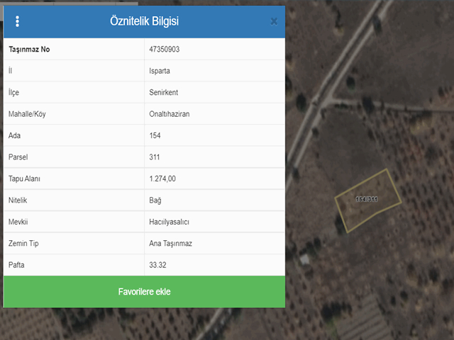 Özellikler: Isparta İli, Senirkent İlçesi, Onaltıhaziran Mahallesi, Hacıilyasalıcı Mevkii, sınırları içinde yer alan; 154 ada 311 parsel sayılı 1274,00 m2 yüzölçümlü Bağ vasıflı taşınmazdır. Konu taşınmaz düz topografik yapıya ve düzgün olmayan geometrik şekle sahiptir. Taşınmaz tüm cephelerinden komşu parseller ile çevrili olup, kadastro yoluna cepheleri bulunmamaktadır. 154 ada 311 parsel üzerinde ~6 adet meyve ağaçları ve gövdesi kesilmiş ağaç kökleri, 154 ada 318 parsel üzerinde ~40 adet karışık meyve ağacı(kiraz ve kayısı) ve ~20 adet üzüm bağı bulunmaktadır. Sulaması kapalı devre sulama sisteminden karşılanmaktadır. Bölge geneli sulama imkanlarına göre elma, kayısı, kiraz, ayaklı üzüm bağı, parcar ve kıraç arazilerde arpa, buğday vb. kuru tarım ürünleri ekimi yapılmaktadır.