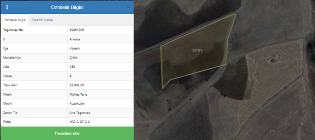 Özellikler: Taşınmaz Ankara ili Kalecik ilçesi Çiftlik mahallesi Kuzukulak mevkiinde 138 ada 4 parsel de yer almaktadır. Taşınmaz 33,664,25 m² yüz ölçümüne sahiptir.