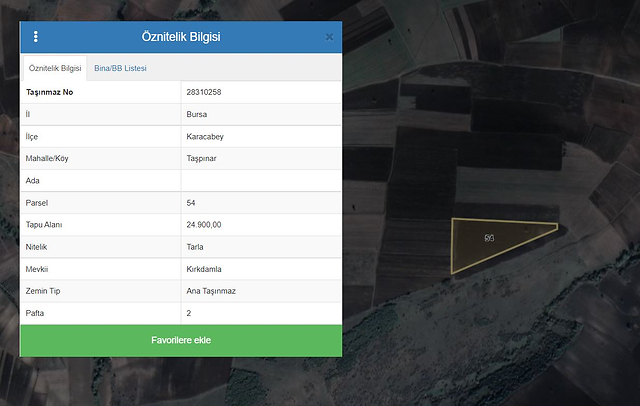 Özellikler: Bursa ili Karacabey ilçesi Taşpınar Mahallesi Kırkdamla Mevkii 0 ada 54 parselde konumlu "Tarla" vasıflı taşınmazdır. Geometrik olarak üçgen formlu olan taşınmazın yüzölçümü 24.900 m2'dir.