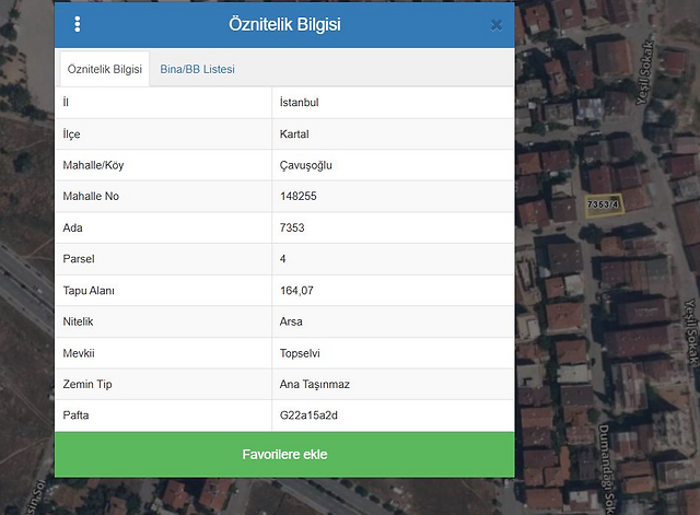Özellikler: İstanbul ili, Kartal ilçesi, Çavuşoğlu Mahallesi, 7353 ada 4 parselde konumlu, `Arsa` nitelikli parseldir. Taşınmaz, İstanbul ili, Kartal ilçesi, Çavuşoğlu Mahallesi 7353 ada 4 parselde konumlu, 164,07 m² yüz ölçümlü ARSA nitelikli taşınmazdır. Topografik olarak düz bir arazi üzerinde konumlu arsa, geometrik olarak dörtgen formdadır. Konu parsel güney ve batı cepheden yola, diğer cephelerden komşu parsellere sınırdır. Parselin Dumanlı sokağa olan cephesi yaklaşık 10 metre ve Gölgeli sokağa olan cephesi yaklaşık 17,8 metredir. Taşınmaz üzerinde herhangi bir yapı bulunmamaktadır. Parselin etrafını çeviren herhangi bir unsur bulunmamaktadır.