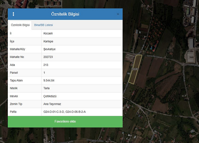 Özellikler: Kartepe İçesi Şevkatiye Mahallesi 213 ada 9.544,84 m² yüzölçümlü 1 parsel sayılı taşınmaz; dikdörtgen geometrik şekle sahiptir. Parselin az eğimli bir topografik yapısı bulunmaktadır. Parselin sınırlarının belirleyen herhangi tel çit v.b. unsurlar bulunmamaktadır. Parselin kuzey cephesinden (Sarıevler Sokak) ve batı cephesinden (Ülker Sokak) imar yollara cephesi bulunmaktadır. Sarıevler sokağa yaklaşık 40 m, Ülker sokağa yaklaşık 222 m cephesi vardır. Parsel üzerinde yapı yoktur.