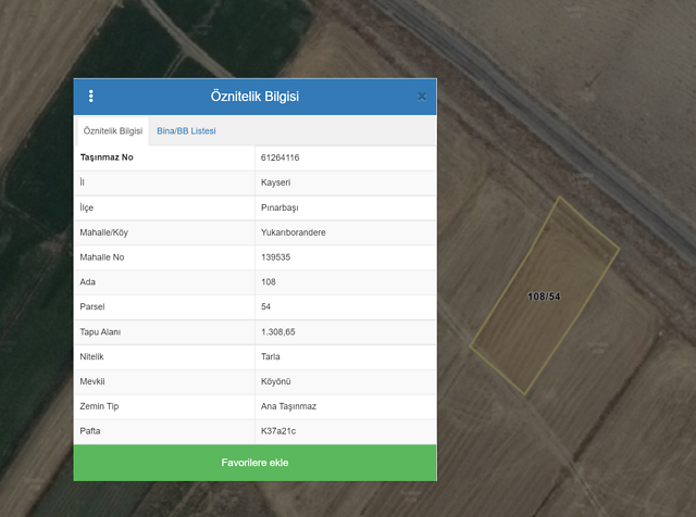 Özellikler: Gayrimenkul Kayseri Pınarbaşı Yukarıborandere 108 ada 54 parselde konumlanmaktadır. Tapu niteliği tarla olan gayrimenkulün tapu alanı 1.308,65 m2'dir. Ekin arazisi olarak kullanılmaktadır. KAYSERİ – MALATYA Otoyoluna yakın konumdadır. Köy yerleşim alanına 1,5 km, İlçe merkezine 14 km mesafededir.