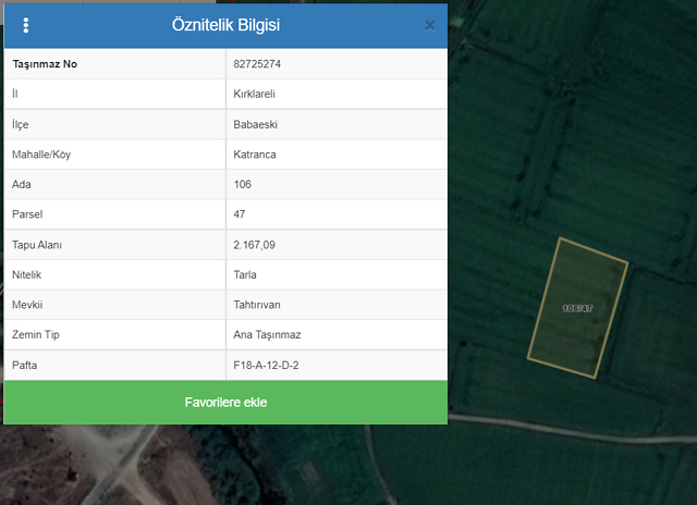 Özellikler: 106 Ada 47 Parselde yer alan taşınmaz 2167,09 m2 alanlı olup tarla vasıflıdır. Taşınmaz dikdörtgen formdadır.