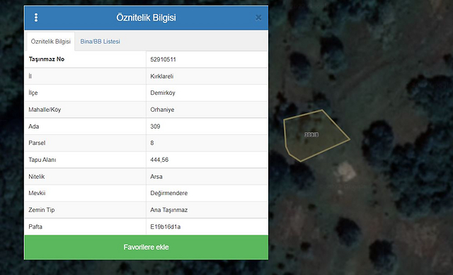 Özellikler : Taşınmaz Kırklareli İli, Demirköy İlçesi, Orhaniye mahallesi 309 ada 8 parselde yer almaktadır. Tapu vasfı 'ARSA ' olup 444, 56 m2 yüzölçümüne sahiptir. Kısmen eğimli bir yapısı vardır.