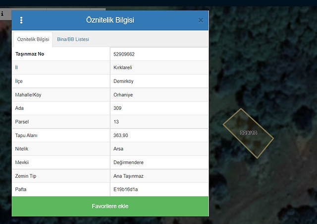Özellikler : Taşınmaz Kırklareli İli, Demirköy İlçesi, Orhaniye mahallesi 309 ada 13 parselde yer almaktadır. Tapu vasfı 'ARSA' olup 363,90 m2 yüzölçümüne sahiptir. Kısmen eğimli bir yapısı vardır.