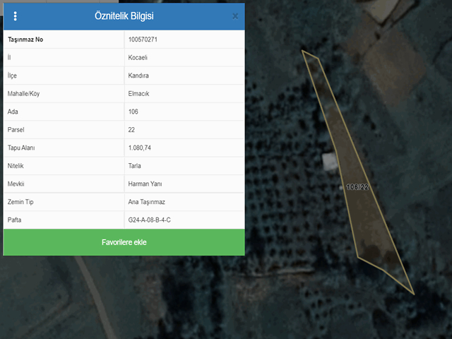 Özellikler: Kocaeli Kandıra Elmacık Mahallesi'nde tarla vasıflı 106 Ada 22 Parsel 1080,74 m2 taşınmazdır. Köy merkezine 273 m, İzmit-Kandıra yoluna 3,14 km'dir.