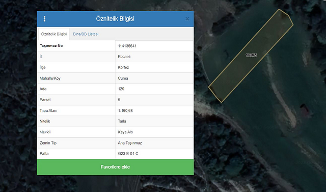 Özellikler : Gayrimenkul Kocaeli ili Körfez ilçesi, Cuma Mahallesi 129 ada 5 parselde yer almaktadır. Tapu vasfı 'TARLA ' olup 1.160,68 m²’dir.Parselin şekli dikdörtgen bir formdadır.