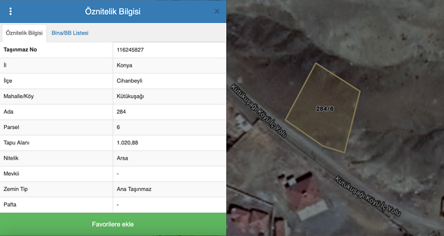 Özellikler: Konya ili, Cihanbeyli ilçesi, Kütükuşağı Mahallesi 284 ada 6 parsel konumlu taşınmaz 1.020,88 m2 yüzölçümlü olup tapu vasfı "Arsa"dır. Taşınmaz geometrik olarak amorf formludur. Taşınmazın yer aldığı parselin yakın çevresinde yapılaşma bulunmaktadır.