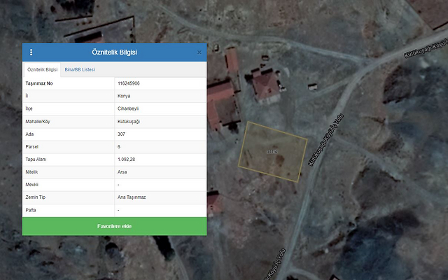 Özellikler: Konya ili Cihanbeyli ilçesi Kütükuşağı Mahallesi 307 ada 6 parsel konumlu taşınmaz 1.092,28 m2 yüzölçümlü olup tapu vasfı "Arsa"dır. Taşınmaz geometrik olarak düzgün formludur. Taşınmazın yer aldığı parselin yakın çevresinde yapılaşma olduğu görülmektedir.