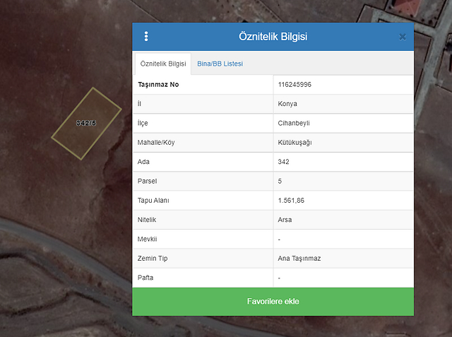 Özellikler: Taşınmaz Konya ili, Cihanbeyli ilçesi, Kütükuşağı Mahallesi'nde 342 ada 5 parselde yer almaktadır. Taşınmazın tapu vasfı 'ARSA'dır. Yüzölçümü 1.561,86 m2'dir.