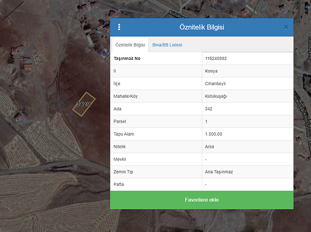 Özellikler: Taşınmaz Konya ili, Cihanbeyli ilçesi, Kütükuşağı Mahallesi'nde 342 ada 1 parselde yer almaktadır. Taşınmazın tapu vasfı 'ARSA'dır. Yüzölçümü 1.500,00 m2'dir.