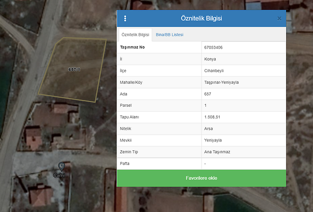 Özellikler: Taşınmaz Konya ili, Cihanbeyli ilçesi, Taşğınar-Yeniyayla Mahallesi'nde 657 ada 1 parselde yer almaktadır. Taşınmazın tapu vasfı 'ARSA'dır. Yüzölçümü 1.508,51 m2'dir.