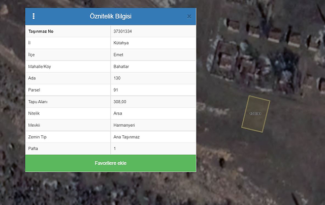 Özellikler: Kütahya ili Emet ilçesi Bahatlar Mahallesi 130 ada 91 parsel konumlu taşınmaz 308 m2 yüzölçümlü olup tapu vasfı "Arsa"dır. Taşınmaz geometrik olarak düzgün formludur. Taşınmazın yer aldığı parselin yakın çevresinde yapılaşma olduğu görülmektedir.